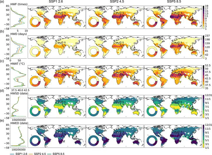 Heat waves are continuous high temperature processes, which are defined as the daily maximum temperature exceeding the absolute-relative combined high temperature thresholds for more than three consecutive days in this study. Because of its unprecedented casualties, devastating compound disasters and irreversible deterioration trends, heat waves have attracted worldwide concern, while its global changes and socioeconomic impacts still need further study. Using three historical reanalysis data and multi scenario CMIP6 modeled data, Global Heat Wave Toolbox (GHWT) was developed to generate heat wave matrix from 1971 to 2100. The long-term changing characteristics of global heat waves were also analyzed. Next, population and GDP projections are employed to estimate future socioeconomic exposure and risks. The results show that except for high latitudes (latitude greater than 60°), high elevations and some coastal areas, heat waves have visited about 45% (±3%) of the global land area (excluding Antarctica). North Africa, North Australia, South Asia, and the Arabian Peninsula are detected as high heat wave area, where experience more than three heat waves with total duration over 15 days annually. Additionally, the average growth rate of global heat waves under SSP2 4.5 and SSP5 8.5 may be 2–3 times and 3–5 times of that under SSP1 2.6, respectively. Under SSP2 4.5, there may be about 7.32 billion people exposed to heat waves in 2100, accounting for 82.65% of the global population. Economic exposure may reach $433.37 trillion in 2100, accounting for 82.23% of the total global economy in that year. India could have the highest population and economic exposure, follow by populous countries, such as Pakistan and Bangladesh, and major economies, such as China and the United States. Under SSP1 2.6, the increase in heat waves may slow down significantly. Moreover, North Africa, Australia, and Brazil are identified as rapid heat wave growth area. Our study highlights the heat wave of future growth and its socioeconomic impacts, as well as the necessity for climate mitigation and adaptation measures.