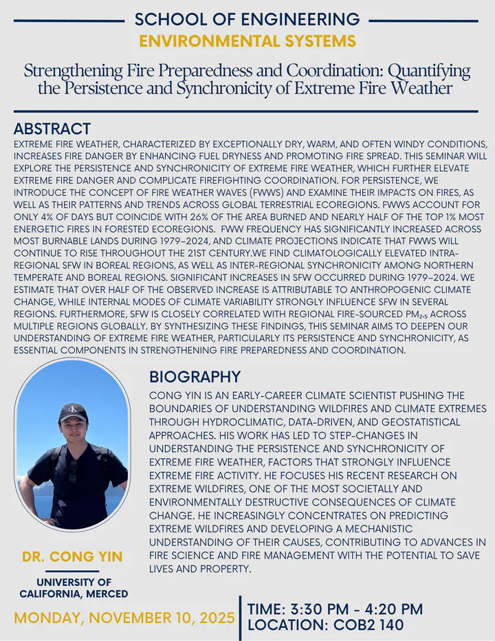 Extreme fire weather, characterized by exceptionally dry, warm, and often windy conditions, increases fire danger by enhancing fuel dryness and promoting fire spread. This seminar will explore the persistence and synchronicity of extreme fire weather, which further elevate extreme fire danger and complicate firefighting coordination. For persistence, we introduce the concept of fire weather waves (FWWs) and examine their impacts on fires, as well as their patterns and trends across global terrestrial ecoregions. FWWs account for only 4% of days but coincide with 26% of the area burned and nearly half of the top 1% most energetic fires in forested ecoregions. Compared with grassland and shrubland fires, forest fires exhibit a larger and more persistent increase in daily burned area in response to FWWs, particularly in Mediterranean forests. FWW frequency has significantly increased across most burnable lands during 1979–2024, and climate projections indicate that FWWs will continue to rise throughout the 21st century. For synchronicity, we examine the patterns and trends of intra- and inter-regional synchronous fire weather (SFW) and explore their links to climate variability and air quality impacts. We find climatologically elevated intra-regional SFW in boreal regions, as well as inter-regional synchronicity among northern temperate and boreal regions. Significant increases in SFW occurred during 1979–2024. We estimate that over half of the observed increase is attributable to anthropogenic climate change, while internal modes of climate variability strongly influence SFW in several regions. Furthermore, SFW is closely correlated with regional fire-sourced PM₂.₅ across multiple regions globally. By synthesizing these findings, this seminar aims to deepen our understanding of extreme fire weather, particularly its persistence and synchronicity, as essential components in strengthening fire preparedness and coordination.