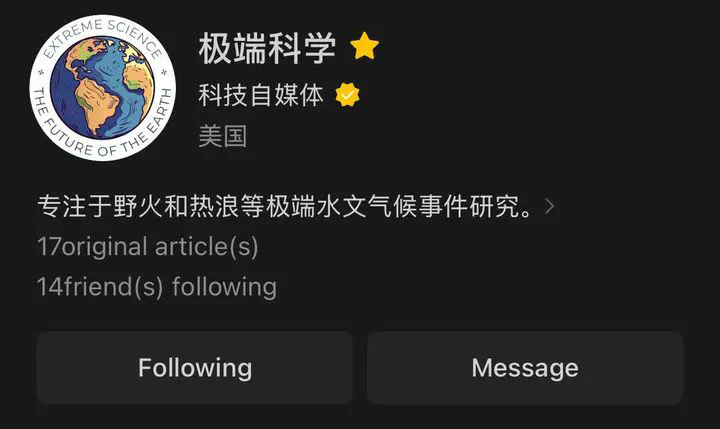 2025年2月22日,我创建了一个微信公众号“极端科学”,聚焦野火和热浪等极端水文气候事件,致力于分享原创研究、领域前沿与实用资源。
